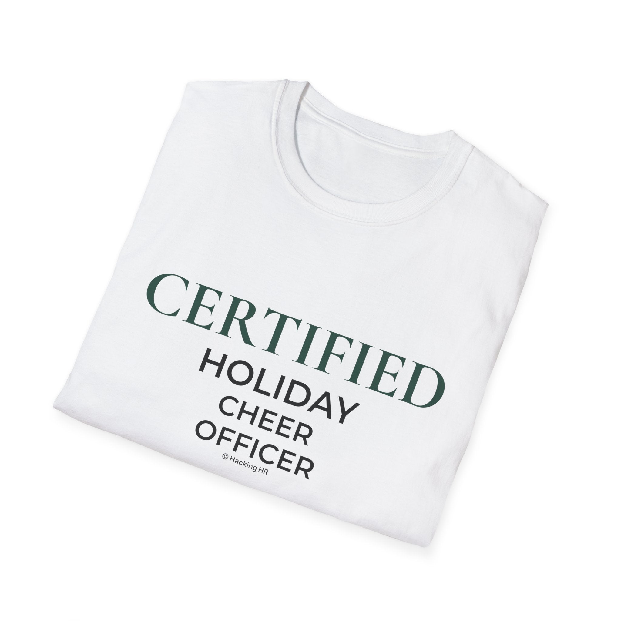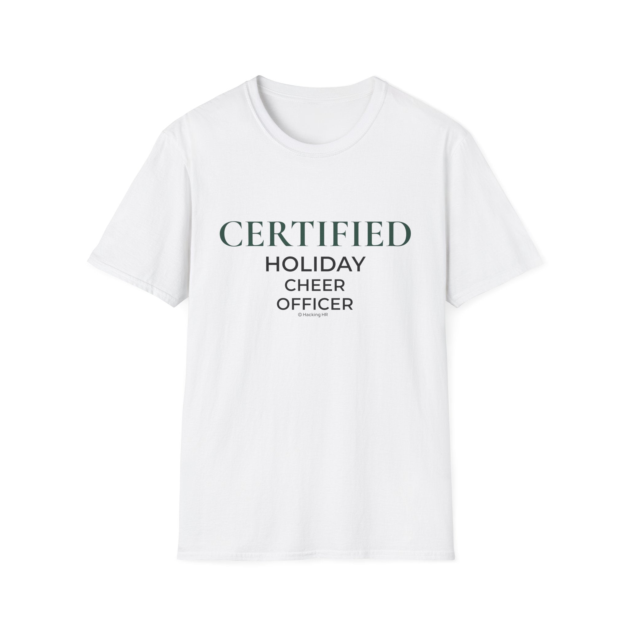 Soft, simple, and quietly festive — this lightweight crew tee carries a subtle holiday wink for the person who curates cheer instead of chasing it. The clean serif lettering reads “CERTIFIED / HOLIDAY / CHEER / OFFICER,” letting the wearer show playful authority when wrapping gifts, hosting low-key dinners, or strolling neighborhood light displays. The breathable, smooth ring-spun cotton feels effortless all season long, and the restrained design pairs easily with jeans, cozy cardigans, or pajamas for morning cocoa runs.