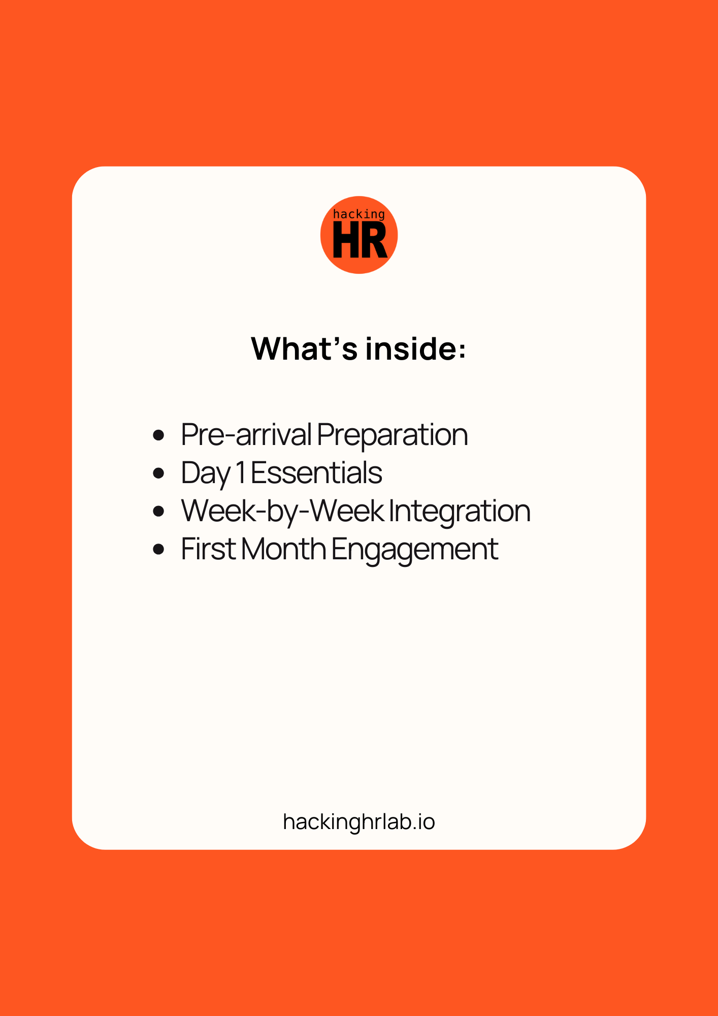 Structured and Effective: Clearly organized steps covering pre-arrival preparations, first-day essentials, first weeks, and initial month activities, ensuring consistency in your onboarding process.