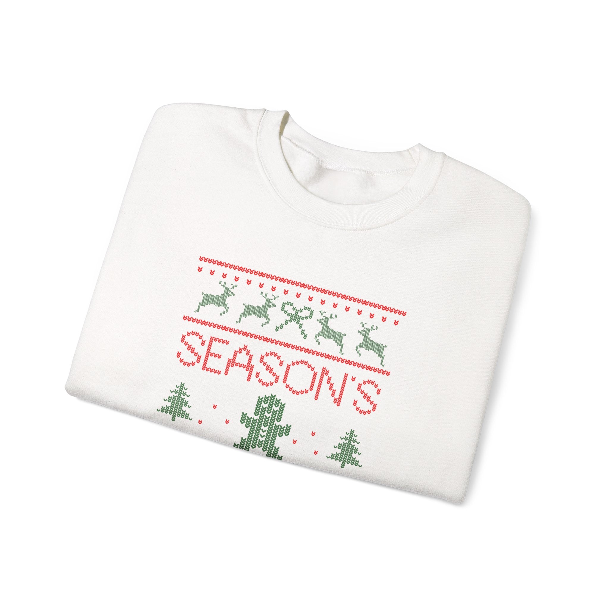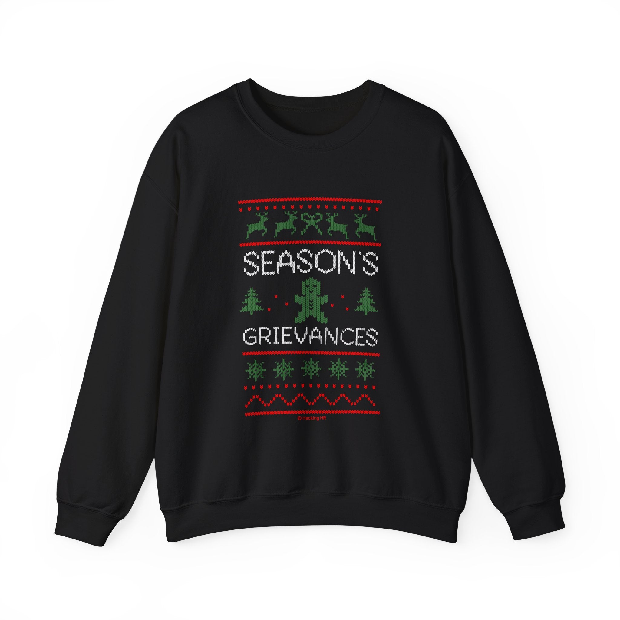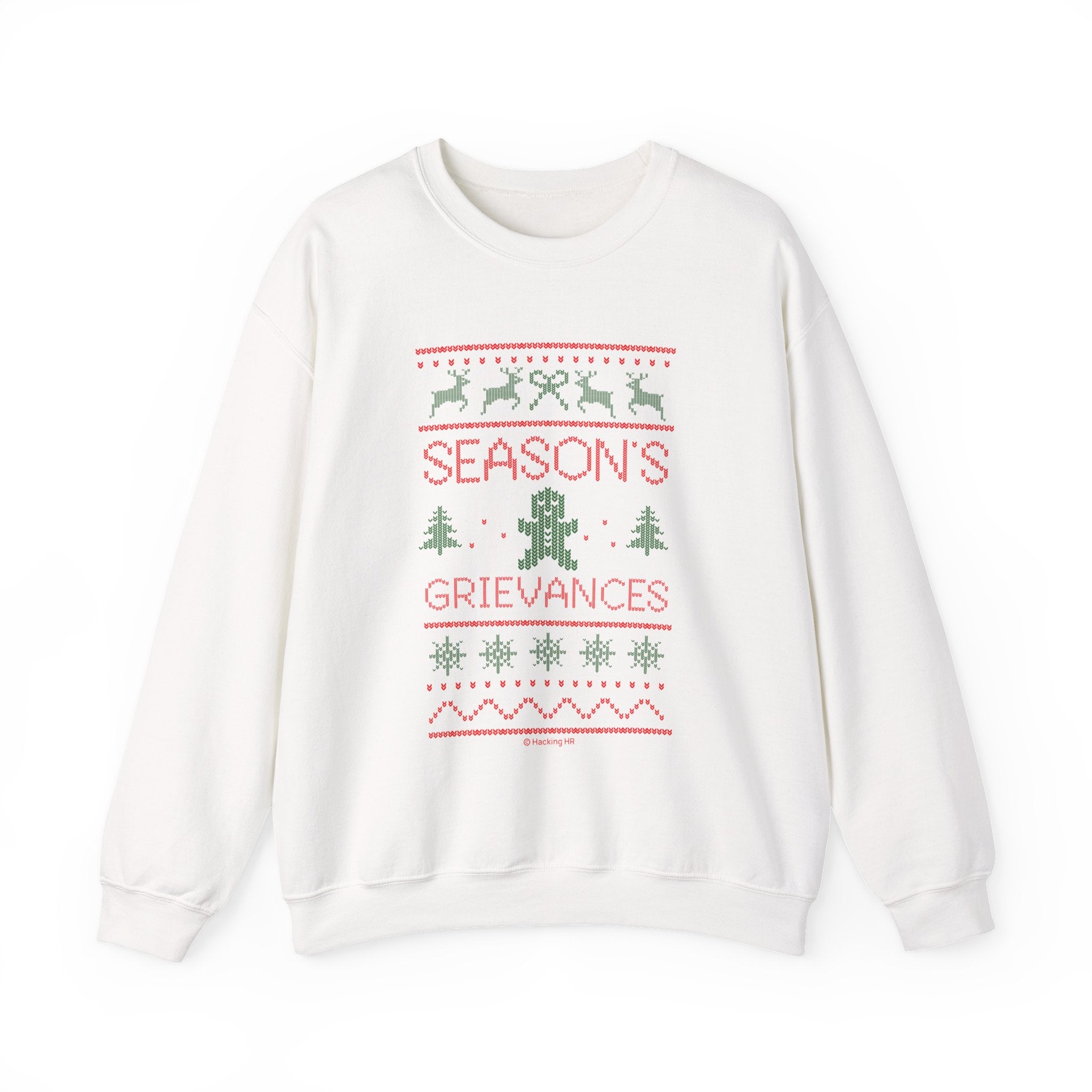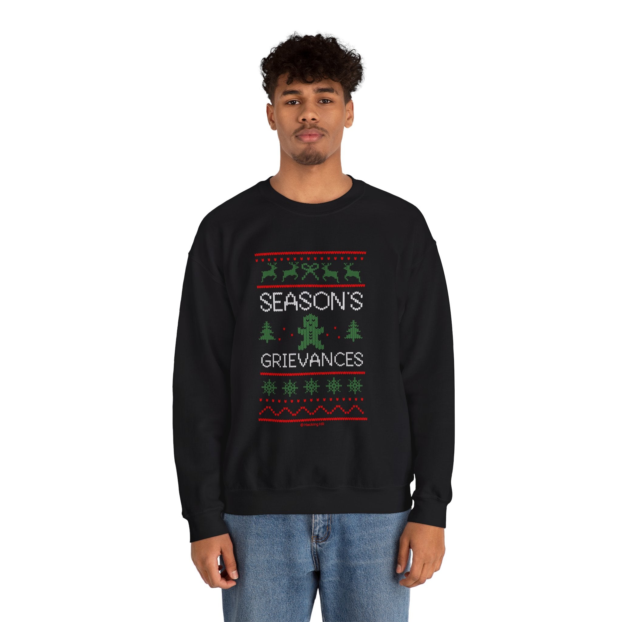 A soft, mid-weight crewneck sweater that carries a wry holiday mood. The vintage-inspired knit-style graphic reads “Season’s Grievances” with tiny reindeer, trees, snowflakes and a disgruntled gingerbread figure—playful and slightly sardonic. The 50/50 cotton‑poly blend feels cozy without being bulky, and the classic crew silhouette wears easily layered over a tee or under a coat. Subtle ribbing at the collar, cuffs and hem keeps the shape, while reinforced double-needle stitching promises long wear. Whether you’re trading holiday chaos for quiet laughs or adding a bit of dry humor to a family gathering, this sweatshirt settles into the season with soft comfort and a knowing grin.